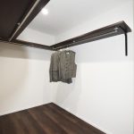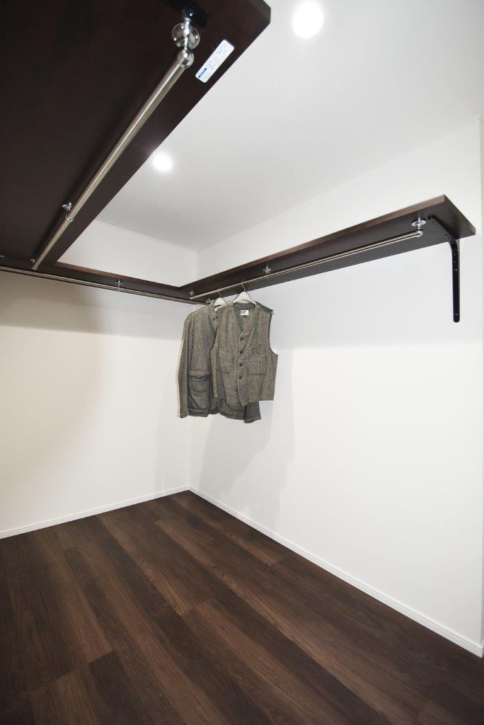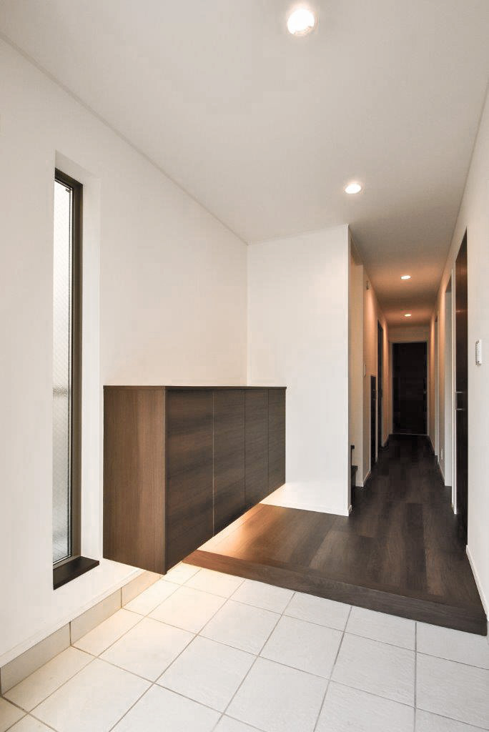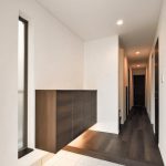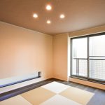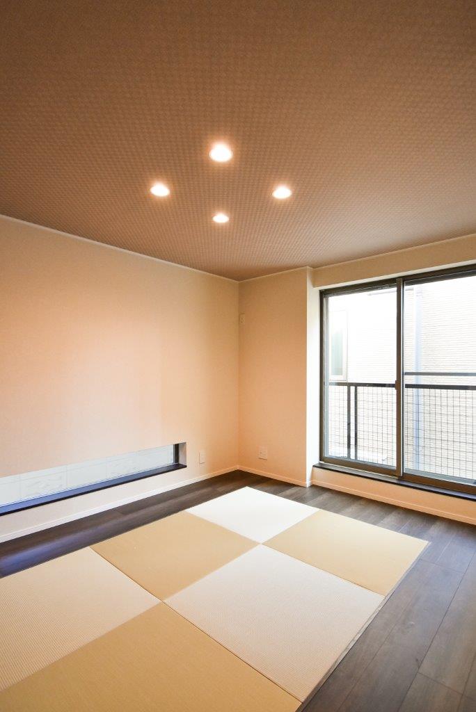 玄関まわりは玄関収納下に間接照明を設け、シンプルな空間の中に温かみとデザイン性を高くしました。またゲストルームとなるモダンのタタミルームは敷きダタミとし、ダウンライトで落ち着いた空間としました。