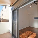 リビング続きには木調デッキを敷いたバルコニーを設け、内部と外部の繋がりを造りました。またバルコニーの位置自体も道路から離して設けることで、プライバシーを確保しつつ、日差しを調整する為のオーニングも設けました。