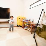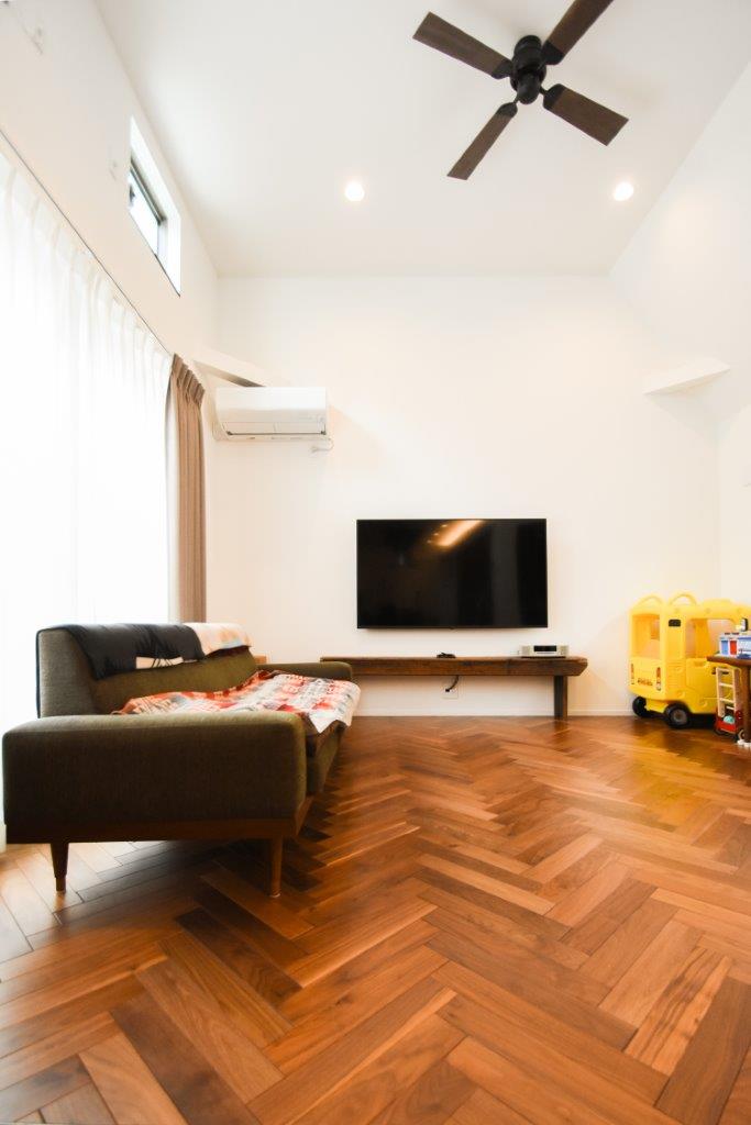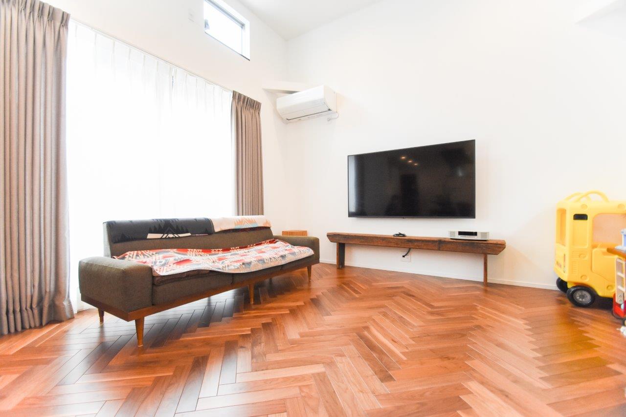 【ヘリンボーン天然木フロアの吹抜けリビング】