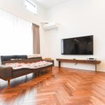 天然木ウォルナットのヘリンボーンフロアのリビングは、天井高さが3.5mの大空間吹抜けにして解放感を創りました。上部にシーリングファンを設置することで温熱環境にも配慮し、1年を通して過ごしやすい空間になっています。